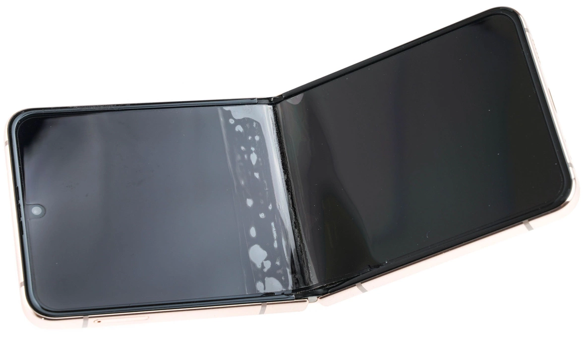 • Smartfon Samsung Flip z 6.7" ekranem głównym, 8GB pamięci RAM i 128GB pamięci operacyjnej. Stan: uszkodzony / uszkodzony wyświetlacz główny - nie wyświetla / przez uszkodzenie ekranu nie otwiera się do końca i krzywo zamyka